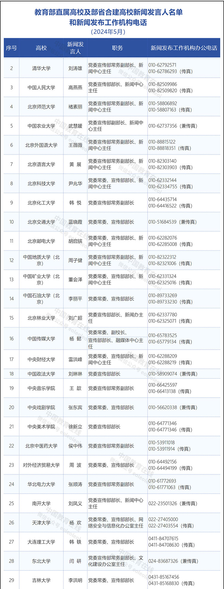 2024年省级教育部门、教育部直属高校新闻发言人名单公布