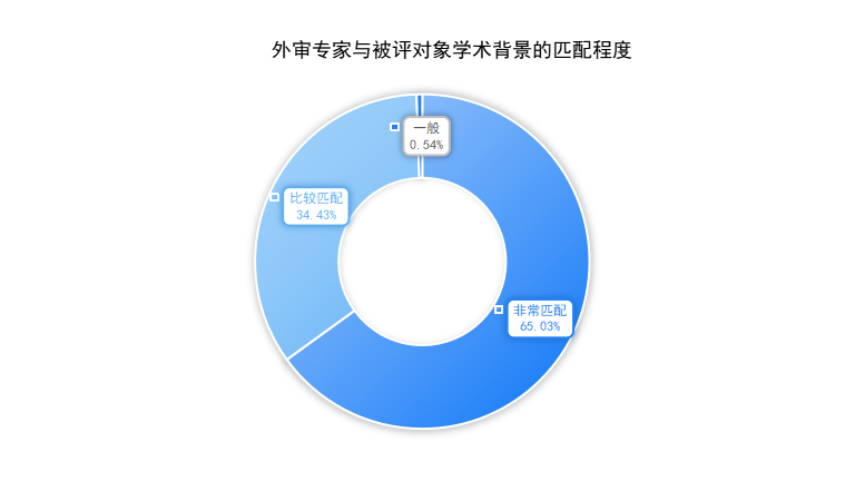 《报告》发现,外审专家认为其与评审对象学术背景的匹配度非常高。外审专家中认为“非常匹配”的占比为65.03%,“比较匹配”的占比为34.43%,两者合计为99.46%,这一数据说明评审对象与评审专家整体学术背景匹配程度非常高。同时,有 0.54%的外审专家表示学科“一般”,这与评审委托单位中的一些冷门及交叉学科评审项目对被评人所处学科的专家匹配要求过于严格有关。