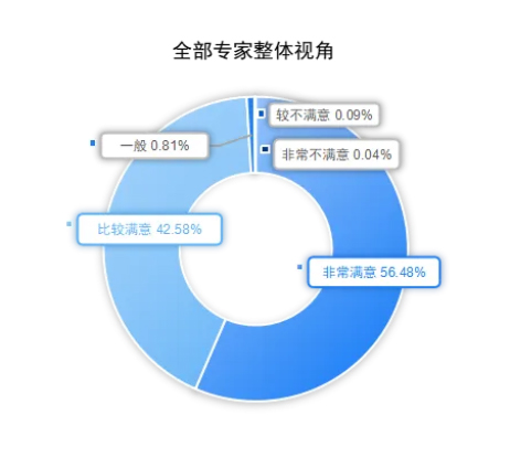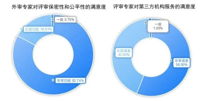 《报告》指出,外审专家对外部评审制度总体满意度非常高。数据显示,在外审专家对于评审过程的保密性和公平性满意度方面,“非常满意”占比82.74%,“比较满意”占比16.51%,两项总和达99%以上;外审专家对于第三方机构提供服务的“非常满意”占比达到56% ,“比较满意”占比43%,两者之和达99%;在对于评审费的支付进度和额度的满意程度上,虽然不同背景的专家有所差异,但总体满意度较高,整体趋势一致,显示出评审制度在经济激励方面的有效性。从调研数据看,外审专家们对外部评审制度的总体评价中,“非常满意”与“比较满意”占比总和达到了99.06%。这反映了外部评审制度在流程设计、公正性、透明度等方面得到了专家的广泛认可。