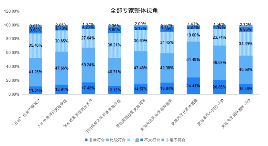 《报告》提醒,高校应持续关注并推进人才评价体系改革,构建一个更加公正、科学和多元化的人才评价体系。调研显示,受访者普遍对高校人才评价改革持积极态度,并对各项改革的认可度维持在“比较符合”的较高水准。按照“非常符合”与“比较符合”选项占比之和统计,其中“更加关注代表作质量”(75.90%)“更加重视小同行评价(70.52%)”“学术成果类型更加多样(67.66%)”,这三项改革都取得了高度的认可,反映出改革在推动同行评价机制的建立和完善上获得了专家的认可。而“更加关注团队整体评价(56.04%)”“不同成果之间折算更加合理(52.83%)”“‘五唯’现象大幅减少(52.79%)”这三个维度中,“一般”评价占比显著高于其他方面,高校人才评价体制机制改革工作依然有待进一步落实。