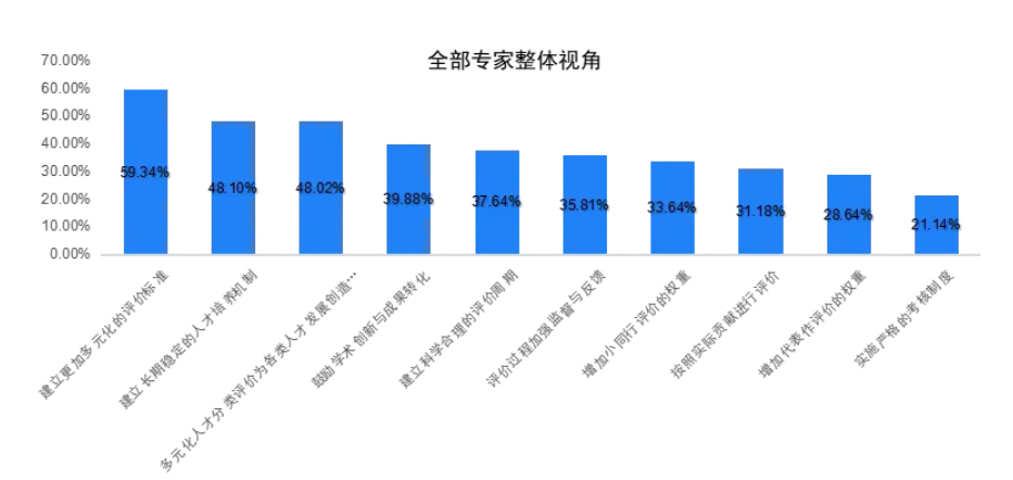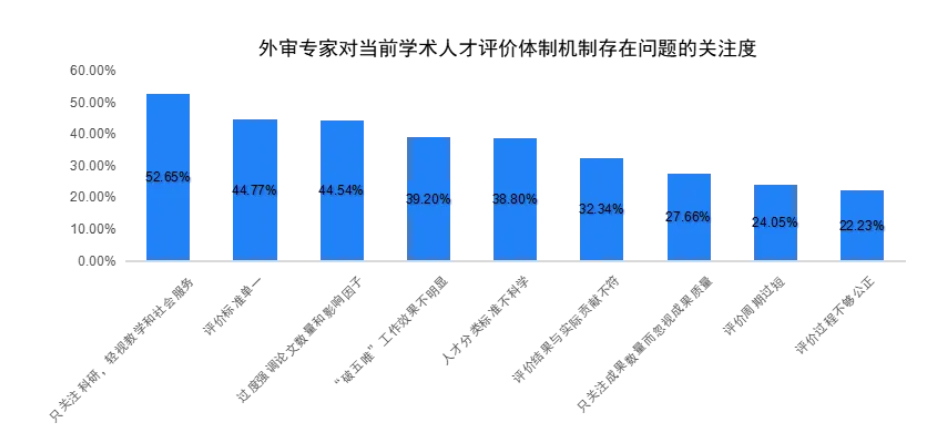 《报告》认为,高校应建立更加多元化的人才评价标准以及长期稳定的人才培养机制。对当前学术人才评价体制机制存在的问题,外审专家关注度最高的是“只注重科研,轻视教学和社会服务(52.65%)”,其次是“评价标准单一(44.77%)”和“过度强调论文数量和影响因子(44.54%)”。总体来看,在高校学术人才评价的改进建议中,外审专家们更建议“建立更加多元化的评价标准”“建立长期稳定的人才培养机制”与“多元化人才分类评价为各类人才发展创造条件”。此外,还应建立长期稳定的人才培养机制,鼓励学术创新与成果转化,并加强评价过程的监督与反馈。