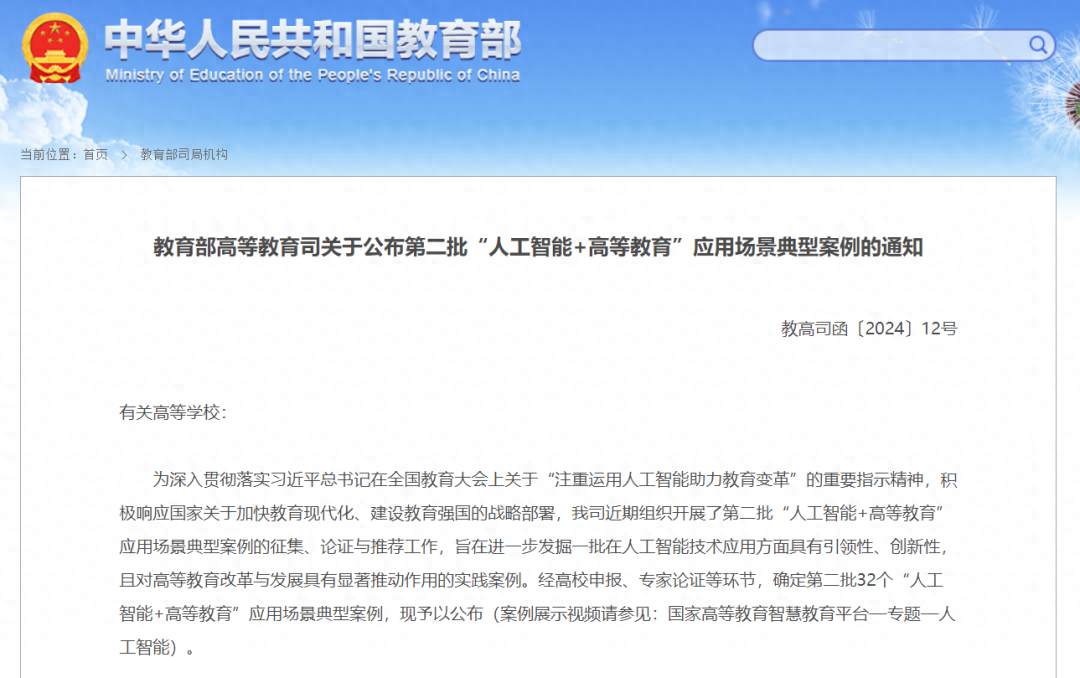 日前,教育部高等教育司发布《关于公布第二批“人工智能+高等教育”应用场景典型案例的通知》,经高校申报、专家论证等环节,确定第二批32个“人工智能+高等教育”应用场景典型案例。