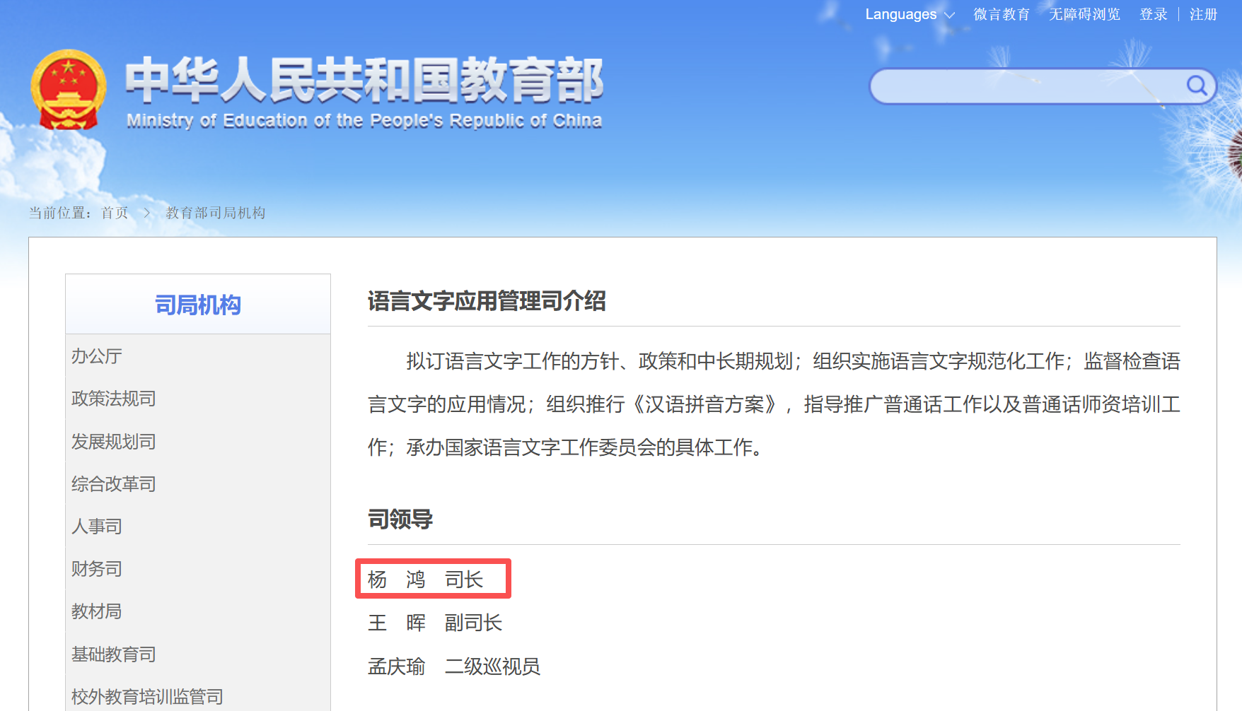 近日,教育部官网显示,杨鸿已任教育部语言文字应用管理司司长。