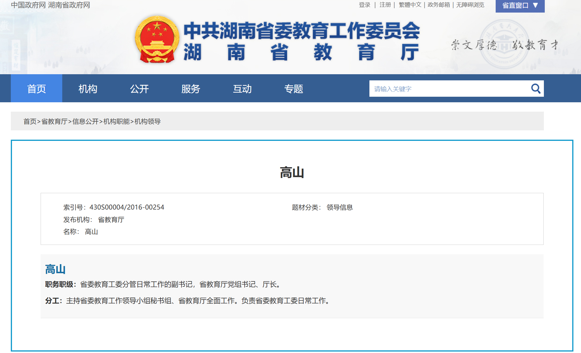 湖南省教育厅官网日前更新显示,高山已任省委教育工委分管日常工作的副书记,省教育厅党组书记、厅长。主持省委教育工作领导小组秘书组、省教育厅全面工作。负责省委教育工委日常工作。