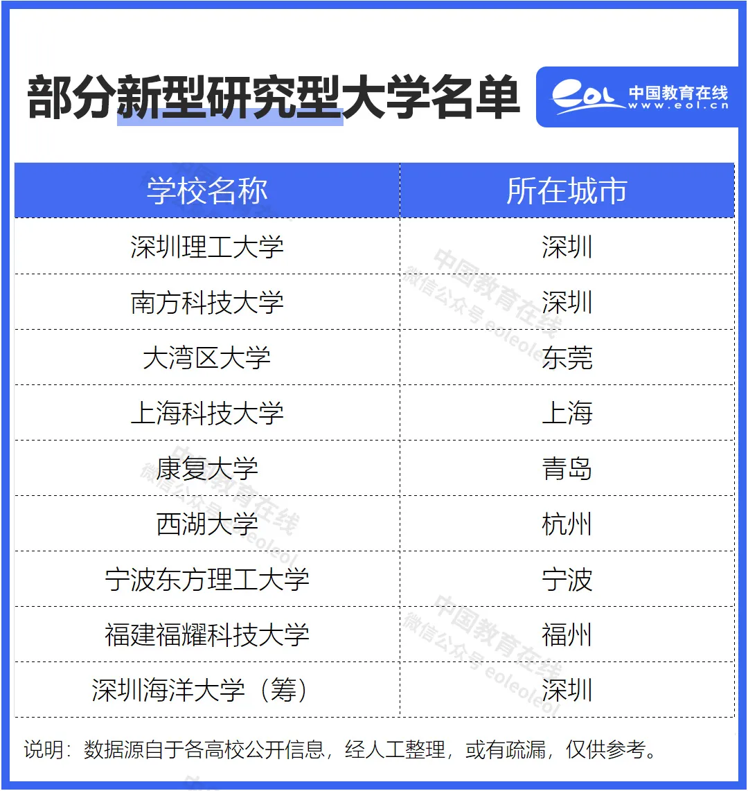 同年6月,杭州市行政审批服务管理办公室网站刊发一则由杭州市规划和自然资源局供稿的文章《钱塘大学获批!为高等教育发展注入强劲动力》显示,钱塘大学用地已于5月17日获得省政府批准,为钱塘大学落地建设筑牢了土地要素根基。我国的新型研究型大学之路,始于2012年。这一年,教育部批准成立南方科技大学,开启了新型研究型大学建设之路。之后,于2013年批准成立的上海科技大学、2018 年设立的西湖大学,均为新型研究型大学。2024年5月,教育部批准设立了深圳理工大学(理工类)和康复大学(医药类),同样定位为高水平新型研究型大学。今年,教育部同意设置福建福耀科技大学、大湾区大学、宁波东方理工大学3所新型研究型大学。此外,正在建设中的深圳海洋大学(筹)定位也是新型研究型大学。