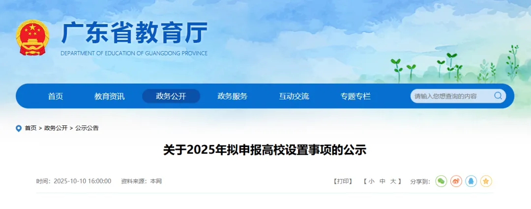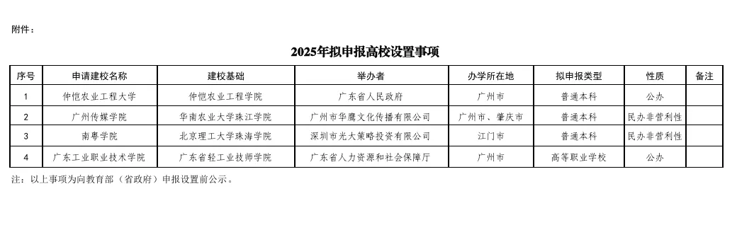 10月10日,广东省教育厅发布关于2025年拟申报高校设置事项的公示。对拟向教育部(省政府)申报的仲恺农业工程学院更名为仲恺农业工程大学、华南农业大学珠江学院转设为广州传媒学院、北京理工大学珠海学院转设为南粤学院、以广东省轻工业技师学院为基础设立广东工业职业技术学院等4个事项予以公示。