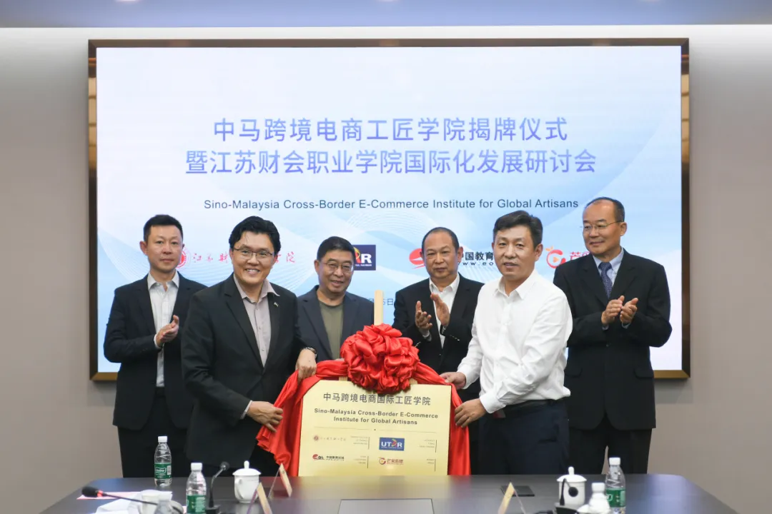 2025年9月25日下午,中国—马来西亚跨境电商国际工匠学院揭牌仪式暨职业教育国际化发展研讨会在连云港顺利举行。中国教育国际交流协会原副秘书长宗瓦、高校毕业生就业协会副会长杨晓春到会指导;拉曼大学副校长倪慕敏教授、拉曼大学创意产业学院及国际传媒学院副院长翁国銪、芒果传媒(马来西亚)有限公司总经理姜忠岐、中国教育在线董事长刘玉明、执行总编任蕾等代表出席;江苏财会职业学院党委副书记、院长费小岩,党委委员、副院长焦建平、张绍光参会,焦建平院长主持本次揭牌仪式。各位嘉宾齐聚现场,共探职教国际化新路径。