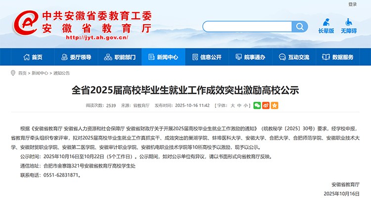 近日,安徽省教育厅发布《全省2025届高校毕业生就业工作成效突出激励高校公示》。经学校申报,省教育厅牵头组织专家评审,拟对2025届高校毕业生就业工作真抓实干、成效突出的巢湖学院、蚌埠医科大学、安徽大学、合肥大学、合肥师范学院、安徽职业技术大学、安徽财贸职业学院、安徽第二医学院、安徽审计职业学院、安徽机电职业技术学院等10所高校予以激励,现予以公示。