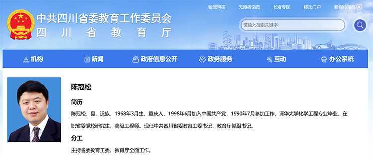 据中共四川省委教育工作委员会、四川省教育厅网站10月20日更新消息,陈冠松已任中共四川省委教育工委书记,教育厅党组书记,主持省委教育工委、教育厅全面工作。