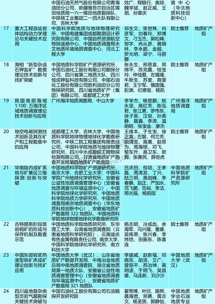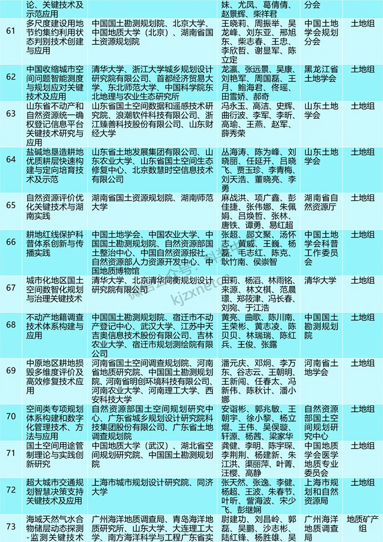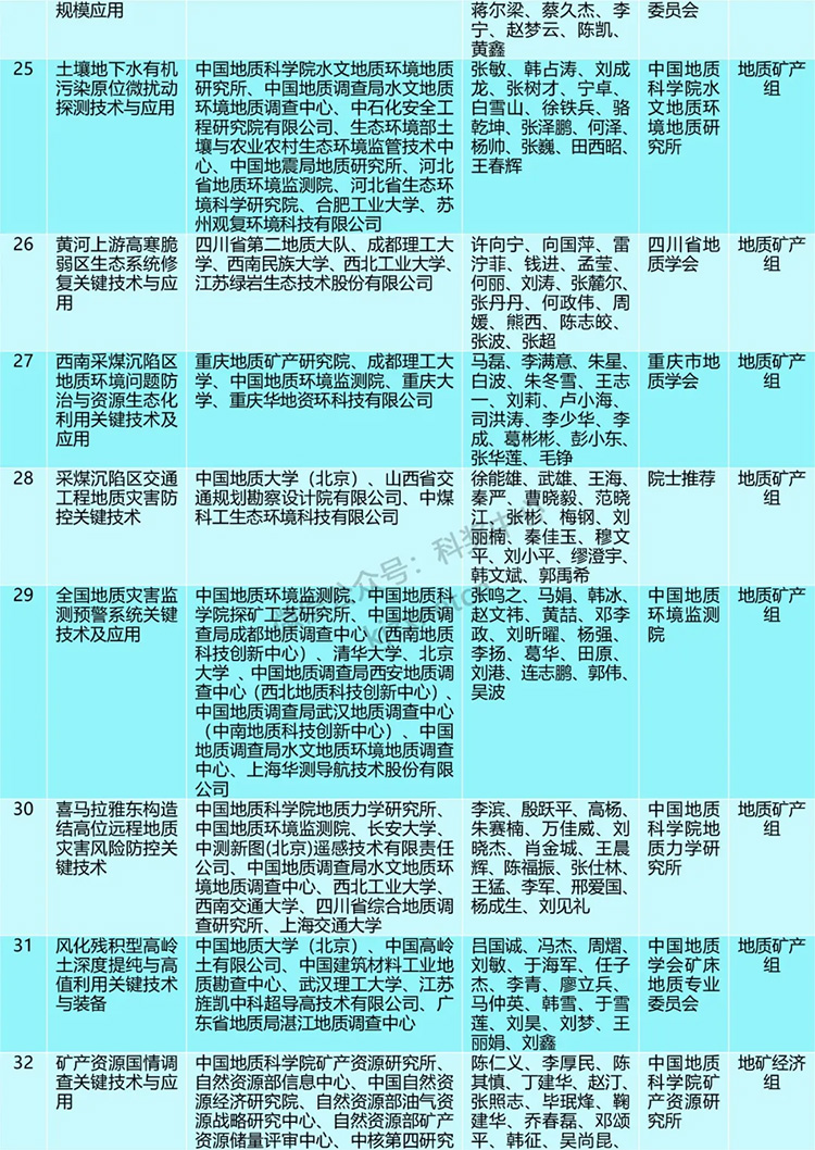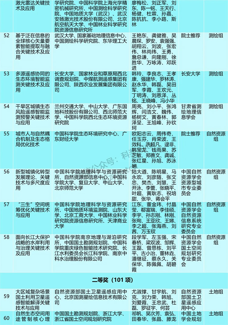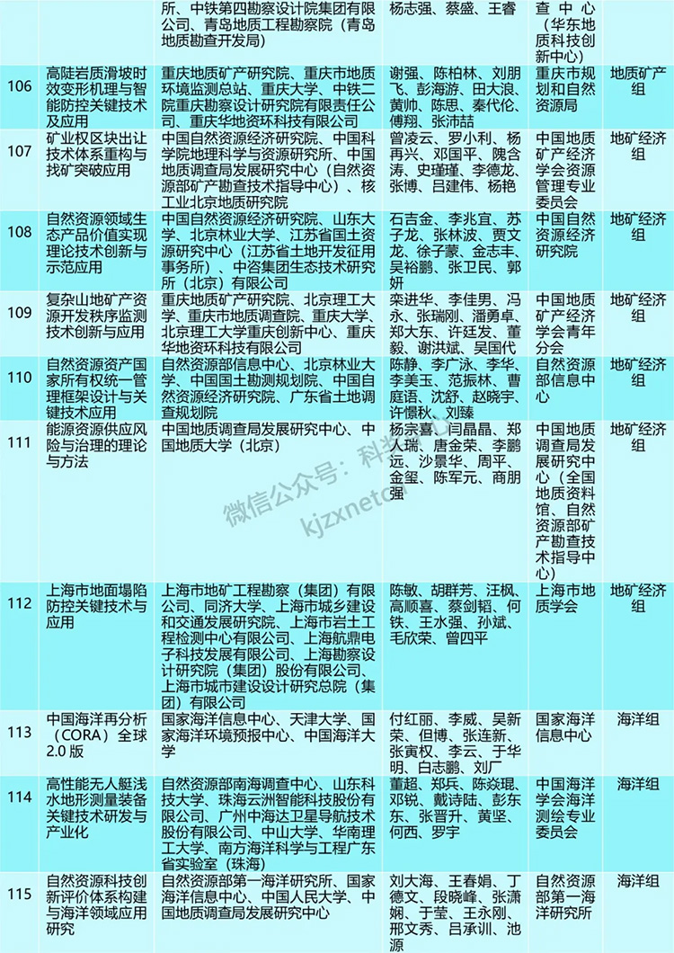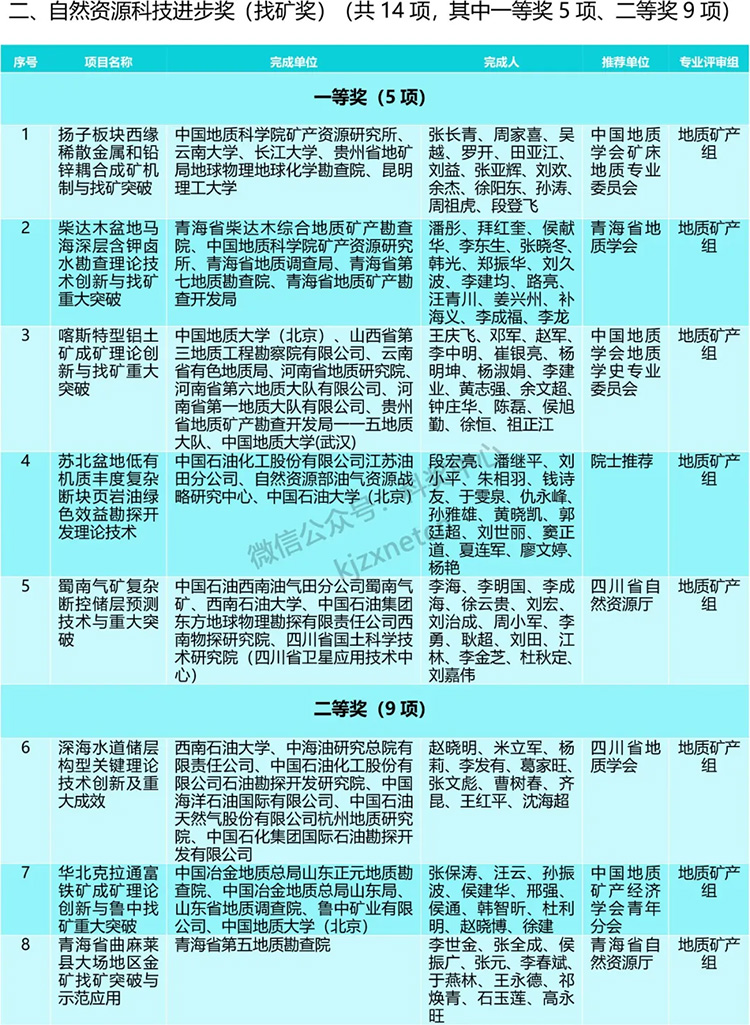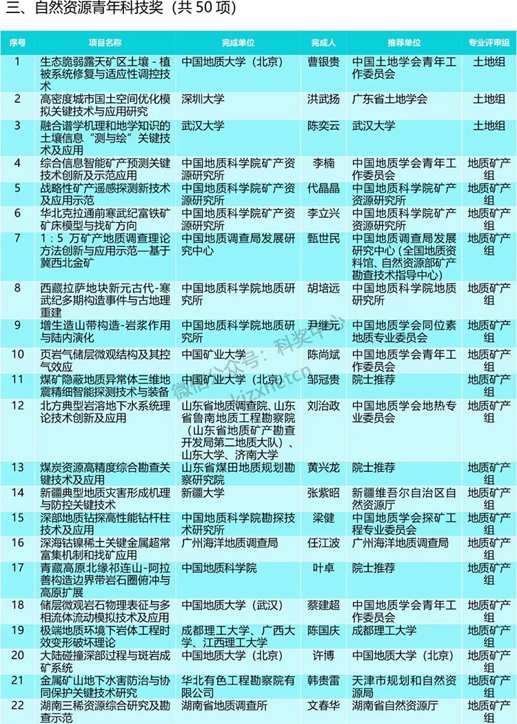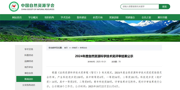 10月22日,自然资源科学技术奖励委员会办公室公示2024年度自然资源科学技术奖评审结果。根据《自然资源科学技术奖章程(暂行)》有关规定,2024年度自然资源科学技术奖经奖励委员会终审,产生科技进步奖159项,其中特等奖4项、一等奖54项、二等奖101项;科技进步奖(找矿奖)14项,其中一等奖5项、二等奖9项;青年科技奖50项,评审结果详见附件。现对评审结果进行公示,公示期10个工作日,公示时间:2025年10月22日至11月4日。