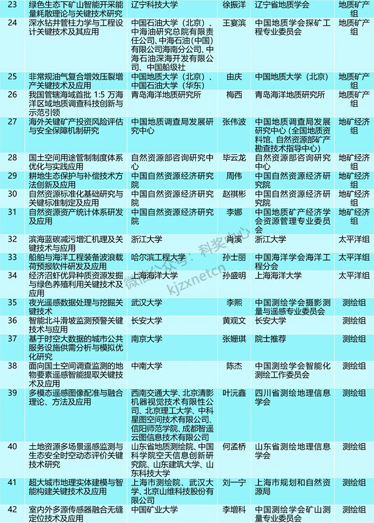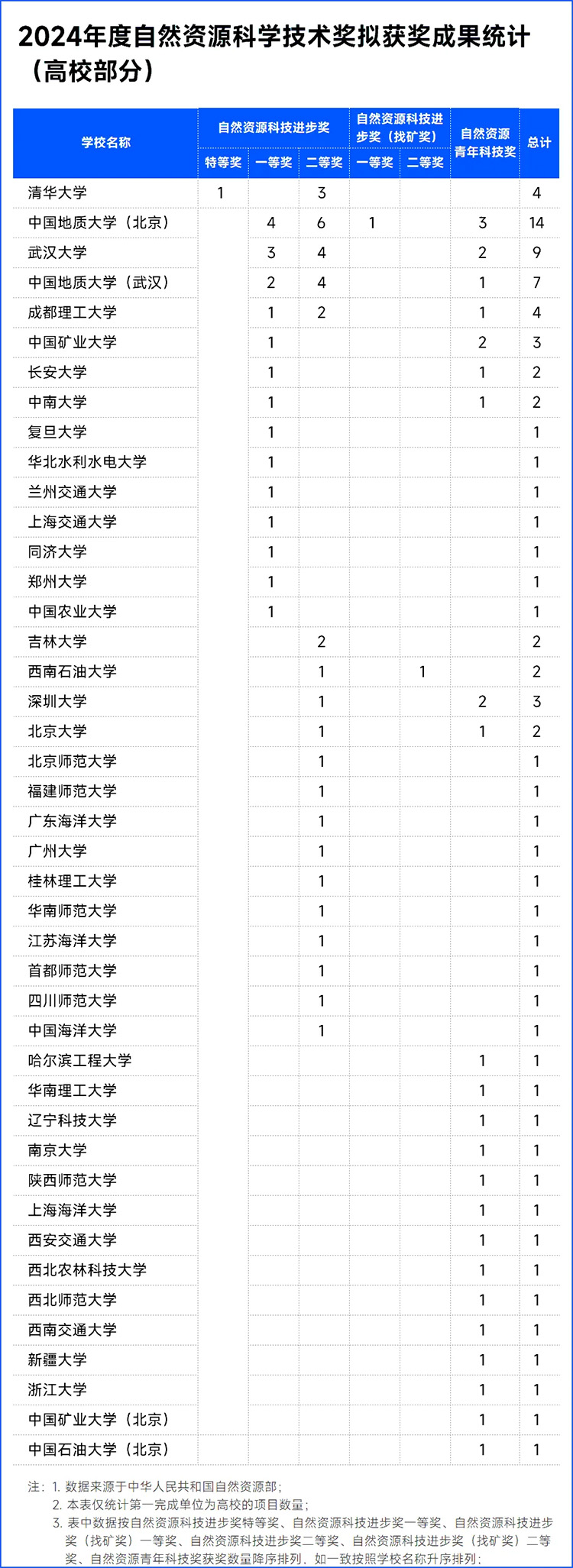 据统计,2024年度自然资源科学技术奖结果中,共有43所高校拟获奖,其中29所高校拟获科技进步奖和科技进步奖(找矿奖)。