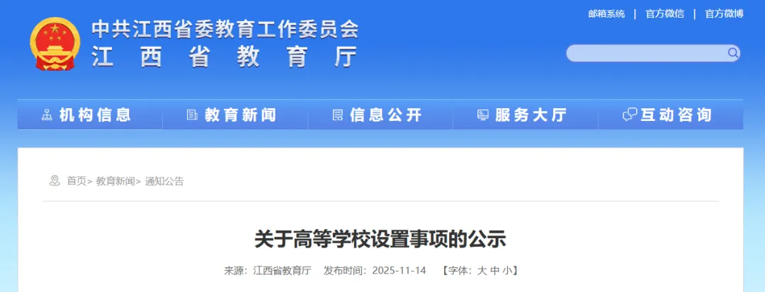 11月14日,江西省教育厅发布《关于高等学校设置事项的公示》。