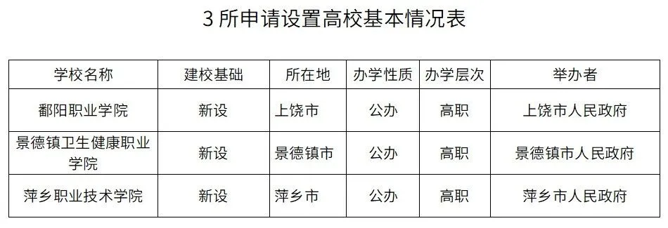 公示内容显示,拟新设的鄱阳职业学院、景德镇卫生健康职业学院、萍乡职业技术学院均为公办性质的高职院校,分别位于江西省的上饶市、景德镇市和萍乡市。