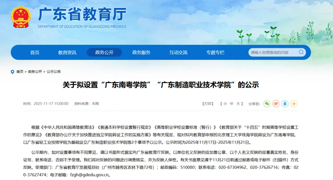 11月17日,广东省教育厅发布《关于拟设置“广东南粤学院”“广东制造职业技术学院”的公示》。根据相关规定,对拟向教育部申报的北京理工大学珠海学院转设为广东南粤学院、以广东省轻工业技师学院为基础设立广东制造职业技术学院等2个事项予以公示。