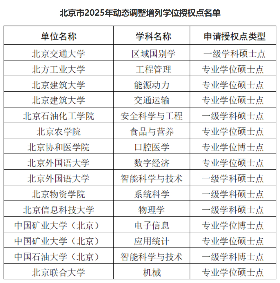 近日,经北京市学位委员会委员会议审议,通过了2025年动态调整增列的硕士学位授权点名单。目前名单正在进行公示,公示期为10个工作日(2025年12月5日至12月14日)。