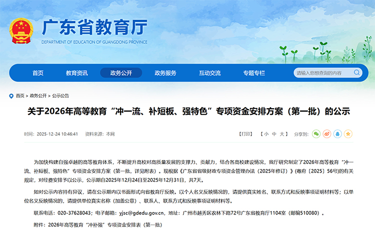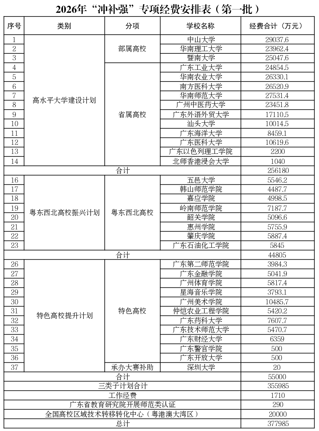 12月24日,广东省教育厅公布《关于2026年高等教育“冲一流、补短板、强特色”专项资金安排方案(第一批)的公示》,拟安排37.7985亿元支持34所高校“冲补强”。