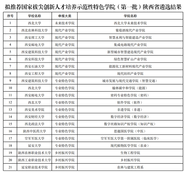根据国家拔尖创新人才培养示范性特色学院遴选推荐工作安排,经省级评议,拟推荐西北大学未来技术学院1个未来技术学院、西北农林科技大学葡萄酒现代产业学院等7个现代产业学院、西安建筑科技大学城市发展与现代交通学院等10个专业特色学院、陕西农林职业技术大学生物工程学院等3个乡村振兴学院参加教育部评选。
