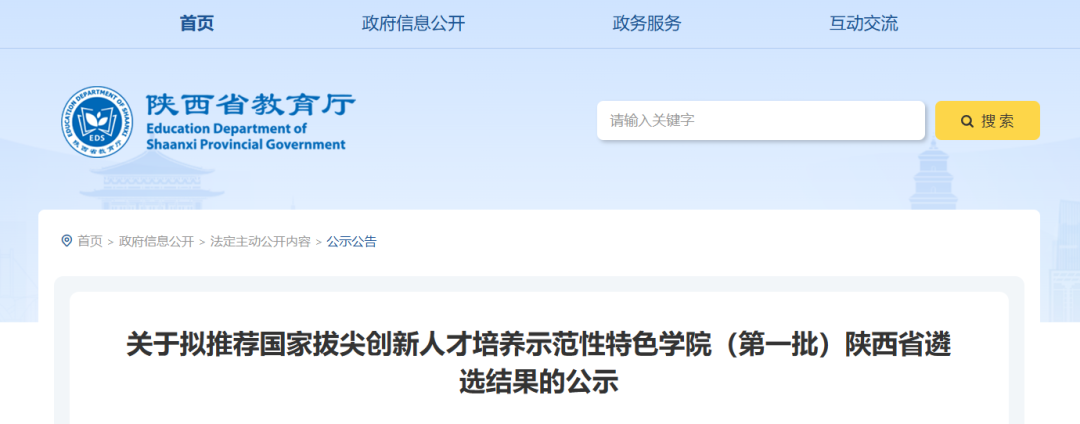 12月26日,陕西省教育厅发布《关于拟推荐国家拔尖创新人才培养示范性特色学院(第一批)陕西省遴选结果的公示》。