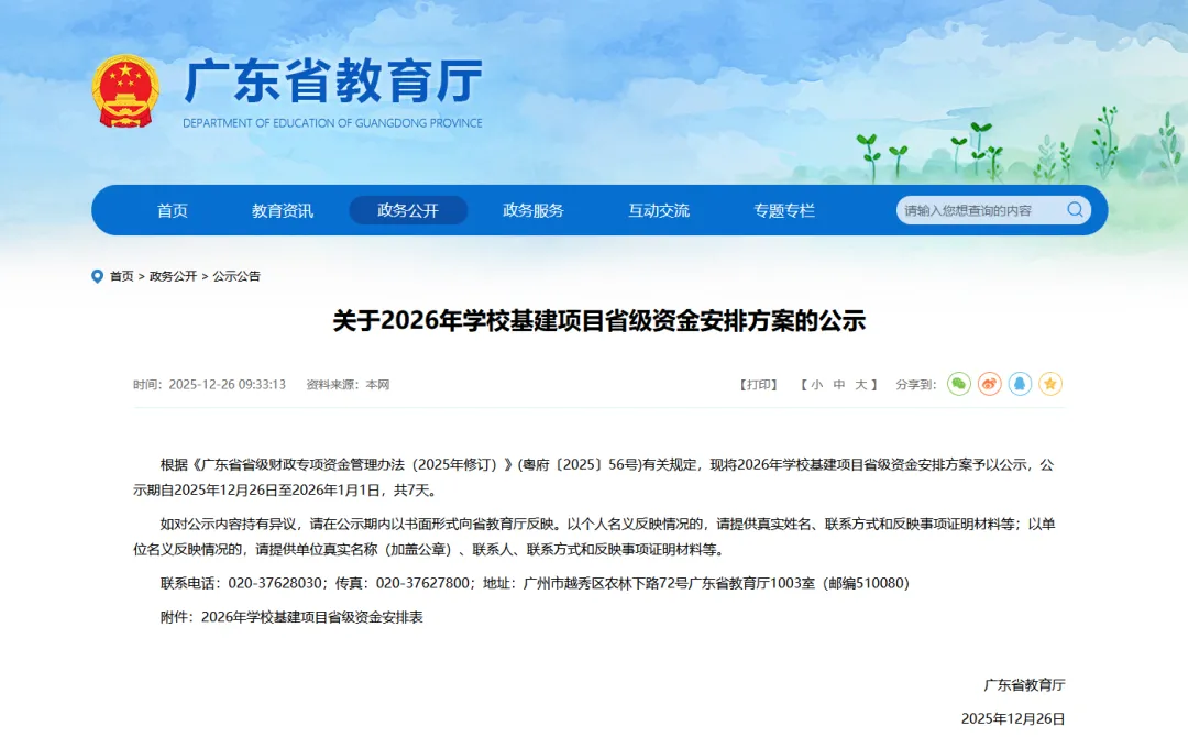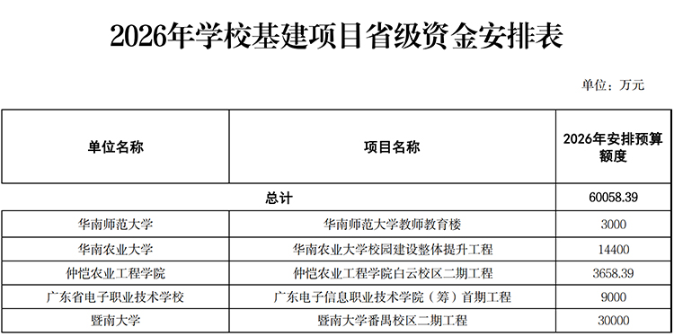 12月26日,广东省教育厅发布《关于2026年学校基建项目省级资金安排方案的公示》。2026年拟安排预算额度共60058.39万元,发放至华南师范大学、华南农业大学、仲恺农业工程学院、广东省电子职业技术学校、暨南大学共5所学校。