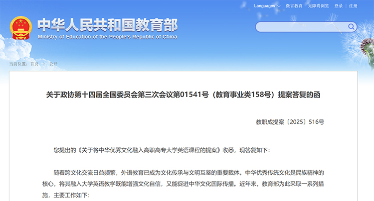 近日,教育部网站公布《关于政协第十四届全国委员会第三次会议第01541号(教育事业类158号)提案答复的函》,对“关于将中华优秀文化融入高职高专大学英语课程的提案”做出答复。