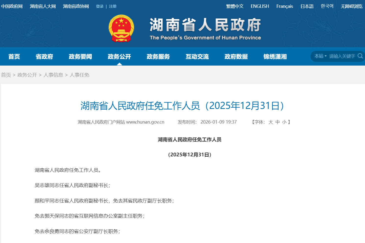 湖南省人民政府网站1月9日发布消息,2025年12月31日,湖南省人民政府任免工作人员,涉及多所高校。