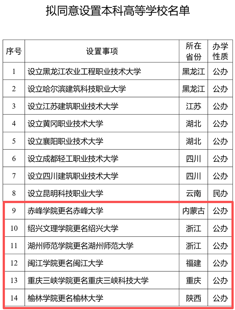 1月12日,教育部发布《关于拟同意设置本科高等学校的公示》。根据有关规定,经教育部党组会议审议,拟同意设置黑龙江农业工程职业技术大学等14所学校,其中,6所学院更名大学。