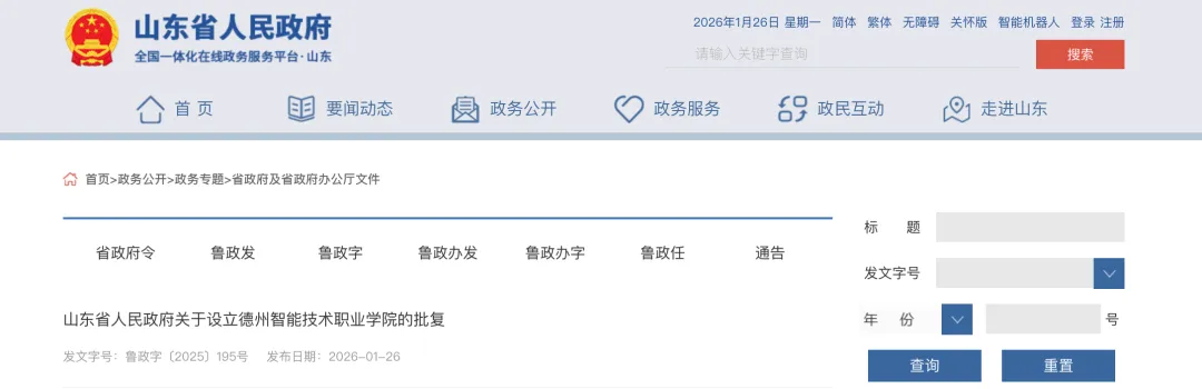 山东省人民政府关于设立德州智能技术职业学院的批复