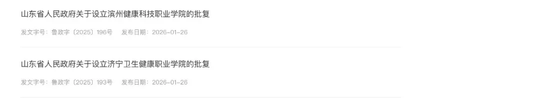 1月26日,山东省人民政府网站发布多条关于设立职业学院的批复文件,拟新设高校分别为:德州智能技术职业学院、青岛健康科技职业学院、滨州健康科技职业学院、济宁卫生健康职业学院。