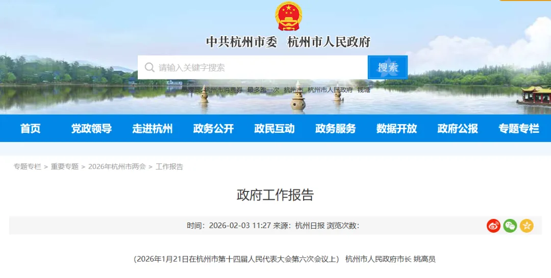 2月3日,2026年杭州市政府工作报告(全文)发布。报告在“十五五”发展主要目标任务中提到:深入实施“双一流196”、高校基础设施提质、“名校名院名所”等重大工程,深化与浙江大学等在杭高校战略合作,推进“环浙大”创新创业生态圈建设,支持西湖大学进入国家“双一流”建设高校序列并成为新型研究型大学标杆、杭州师范大学争创国家A类学科、浙大城市学院建设高水平一流应用型大学、钱塘大学建设新型研究型大学。