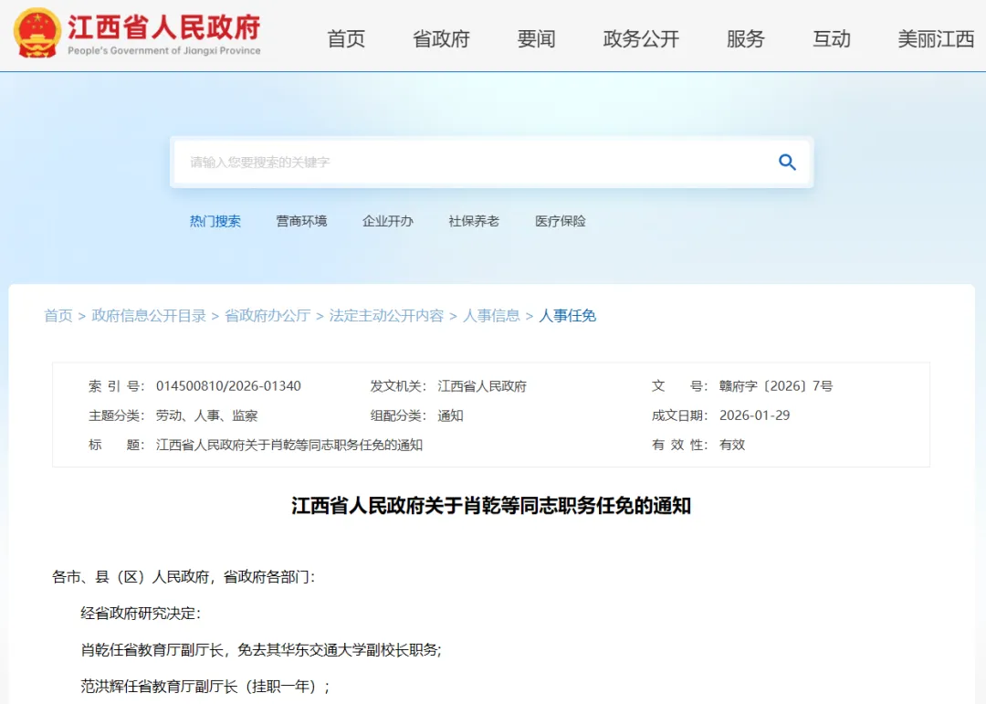 近日,江西省人民政府发布最新任免通知。经省政府研究决定:肖乾任省教育厅副厅长,免去其华东交通大学副校长职务;范洪辉任省教育厅副厅长(挂职一年)。