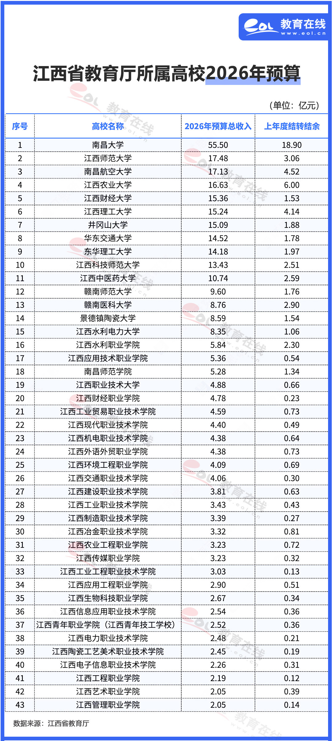 近日,江西省教育厅公布了2026年所属单位预算信息,其中包含了43所高校。