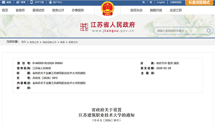 3月3日,江苏省人民政府发布《省政府关于设置江苏建筑职业技术大学的通知》。为深入贯彻习近平总书记关于教育的重要论述和对江苏工作重要讲话精神,深化现代职业教育体系建设改革,推动本科层次职业教育稳步发展,培养更多高素质技术技能人才,经研究并报教育部同意,以江苏建筑职业技术学院为基础设立江苏建筑职业技术大学,同时撤销江苏建筑职业技术学院的建制。江苏建筑职业技术大学为省属公办本科层次职业学校。