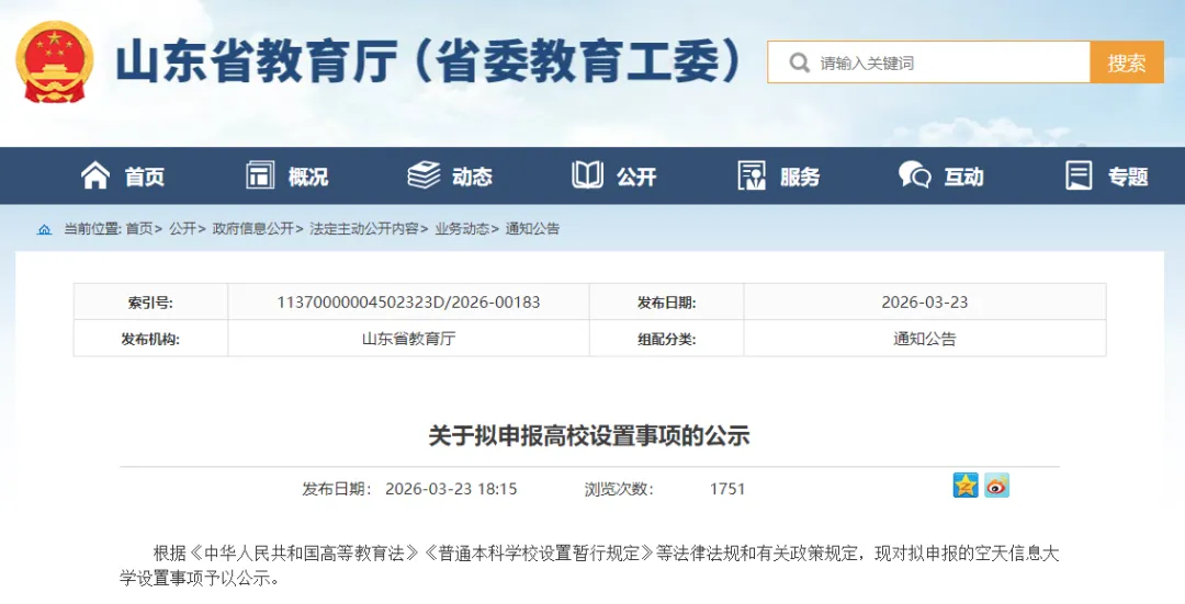 3月23日,山东省教育厅发布《关于拟申报高校设置事项的公示》。根据《中华人民共和国高等教育法》《普通本科学校设置暂行规定》等法律法规和有关政策规定,现对拟申报的空天信息大学设置事项予以公示。