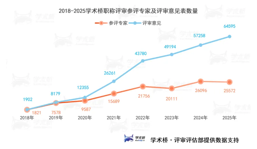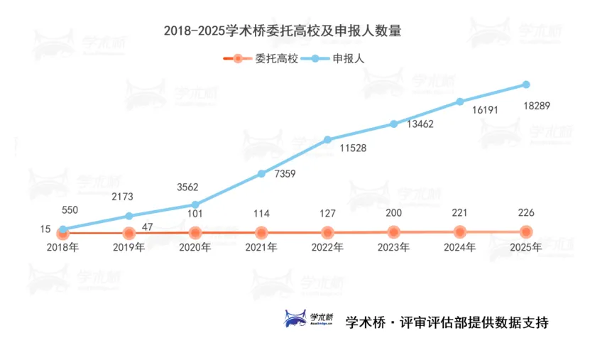 《报告》显示,第三方评价模式成为越来越多高校的选择。自2018年的15所起,委托学术桥进行各类评审的高校数量至2025年增长到226所,增长1407%。其中,“双一流”建设高校共67所,占委托高校总数的29.65%。申报人数量从2018年的550人增长至2025年的18289人,增长33.25倍。随着委托高校及申报人数量的激增,职称外审服务对参评专家的需求也同步大涨。2018-2025年,参评专家从1821位增长至25572位,增长13.04倍;评审意见表从1902份增长至64595份,增长32.96倍。