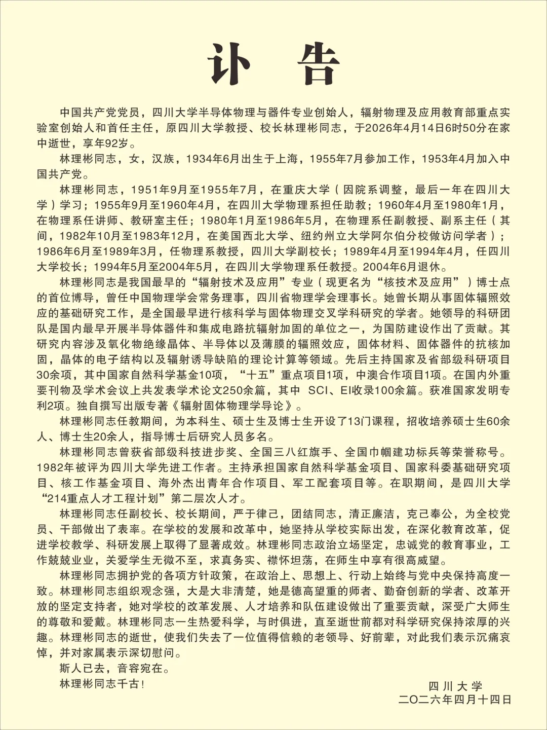 4月14日,从四川大学获悉,中国共产党党员,四川大学半导体物理与器件专业创始人,辐射物理及应用教育部重点实验室创始人和首任主任,原四川大学教授、校长林理彬同志,于14日6时50分在家中逝世,享年92岁。