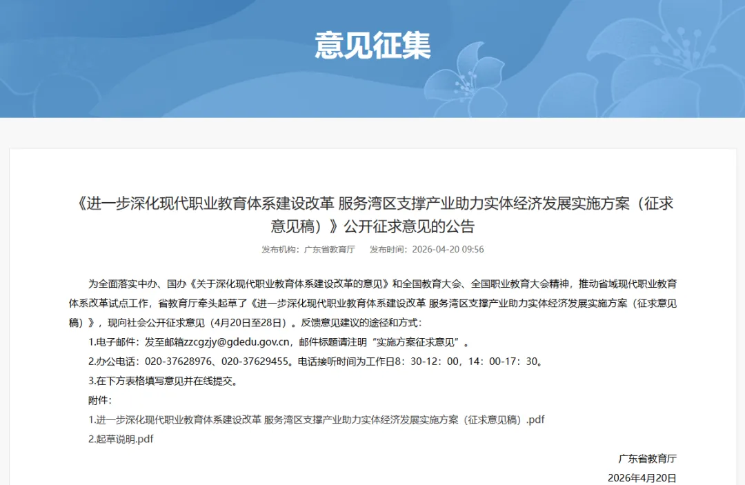 近日,广东省教育厅牵头起草了《进一步深化现代职业教育体系建设改革 服务湾区支撑产业助力实体经济发展实施方案(征求意见稿)》(以下简称《征求意见稿》)。