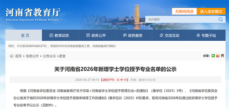 4月27日,河南省教育厅官网发布《关于河南省2026年新增学士学位授予专业名单的公示》,根据《河南省学位委员会 河南省教育厅关于印发<河南省学士学位授予管理办法>的通知》(豫学位〔2025〕3号)、《河南省学位委员会办公室关于做好2026年新增学士学位授予资格审核等工作的通知》(豫学位办〔2025〕6号)要求,现将河南省2026年拟通过的新增学士学位授予专业名单予以公示。