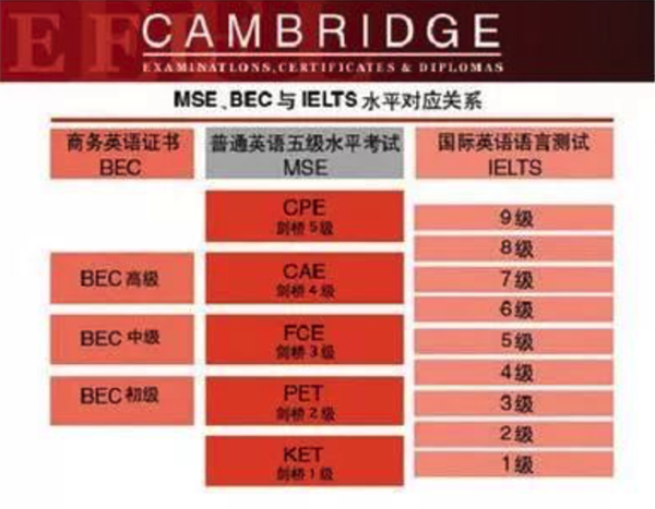 MSE系列考试是剑桥最早开发的英语考试体系,有100多年的历史,也是雅思考试的鼻祖,其内容、题型、结构与雅思考试相同,只是雅思考试更有难度且专门作为高等教育入学和移民的水平参考。MSE系列考试按照难度由低到高分为五个等级(即KET、PET、FCE、CAE、CPE)。KET和PET为低中级考试,对应通用英语水平的“入门”和“基本达标”,鼓励英语学习者“学习先导,以测促学,逐步进阶”。