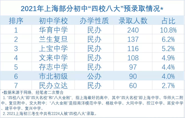 从表中不难看出,在上海中招成绩排名前7的初中,有6所是民办校,只有1所公办校,市北初级中学能“硕果仅存”,据说源于该校享受独特的理科实验班招生政策。