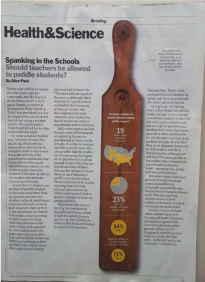 2012年,在旧金山转机时,无意间买了一份时代周刊,一篇讨论体罚的报道《spanking in the schools》,让我第一次深刻认识到spanking这个词的本质含义,突然醒悟到,世界上很多基本道理是一样的。美国打孩子的板子,和我们的戒尺是如此相似。我也第一次意识到,我和很多中国家长,实际上完全被很多专家所蒙蔽,甚至是欺骗了。至今,美国仍然有19个州,在法律层面支持或允许体罚,体罚也在英美很多私立或者说贵族中学普遍存在,包括关黑屋子(禁闭),打板子等等。包括伊顿公学在内的很多英联邦的贵族学校里,鞭笞仍然是学校的惩戒手段,有些甚至直接挂在教室里。