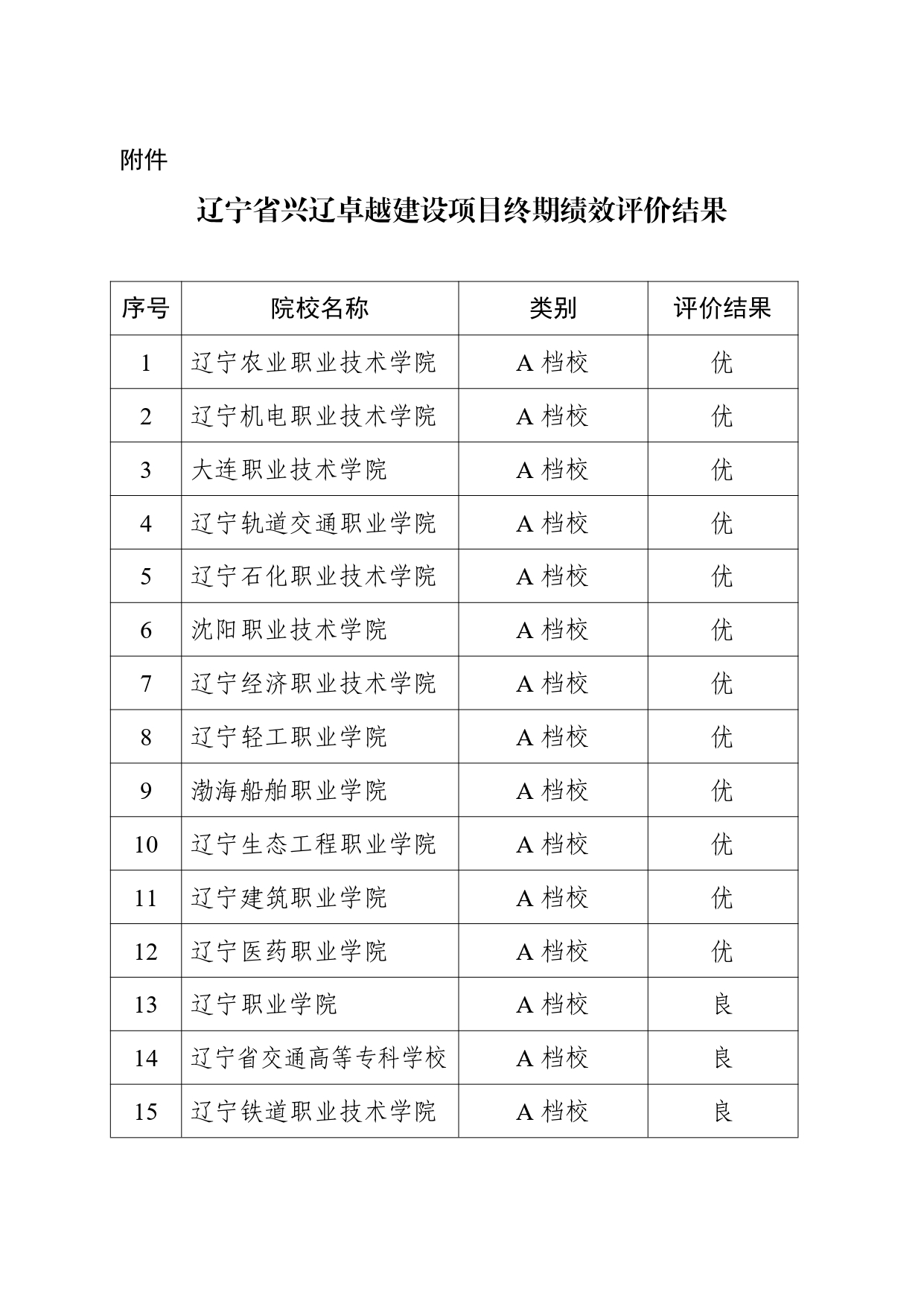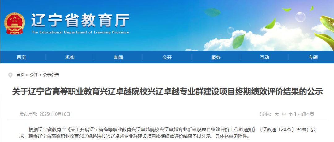 10月16日,辽宁省教育厅发布《关于辽宁省高等职业教育兴辽卓越院校兴辽卓越专业群建设项目终期绩效评价结果的公示》。