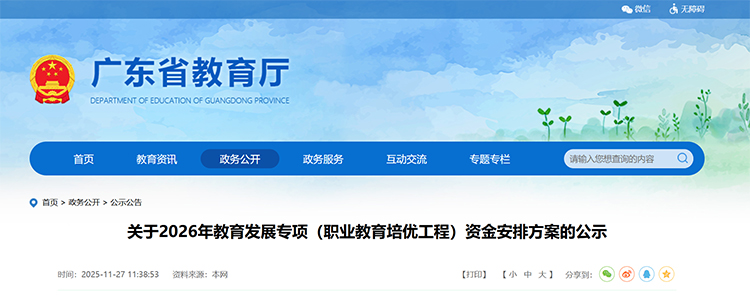 11月27日,广东省教育厅网站发布《关于2026年教育发展专项(职业教育培优工程)资金安排方案的公示》。
