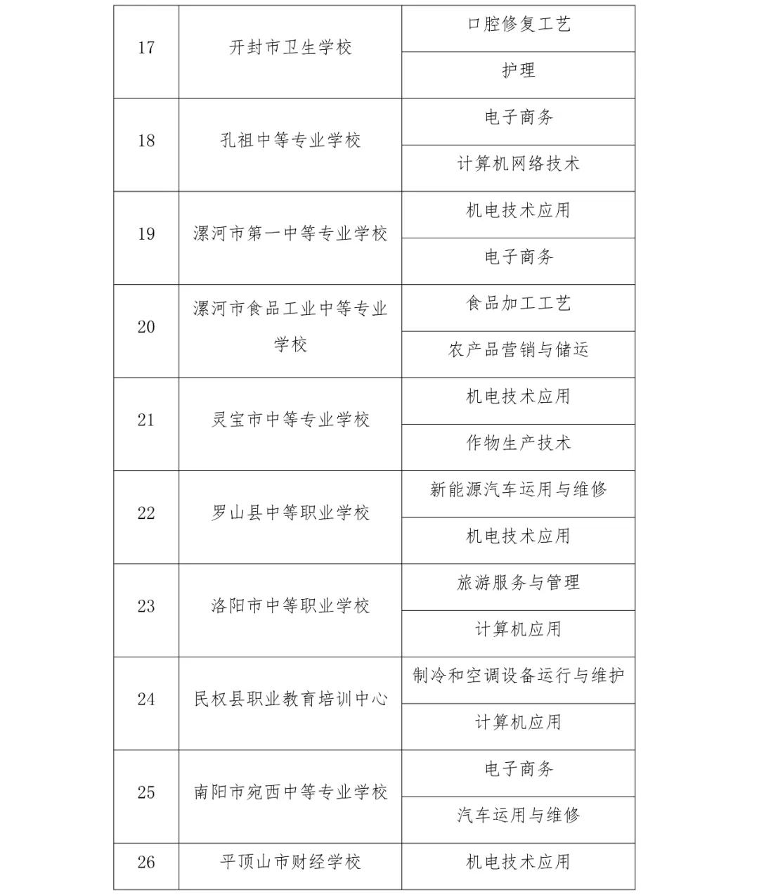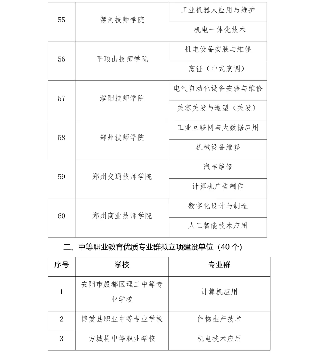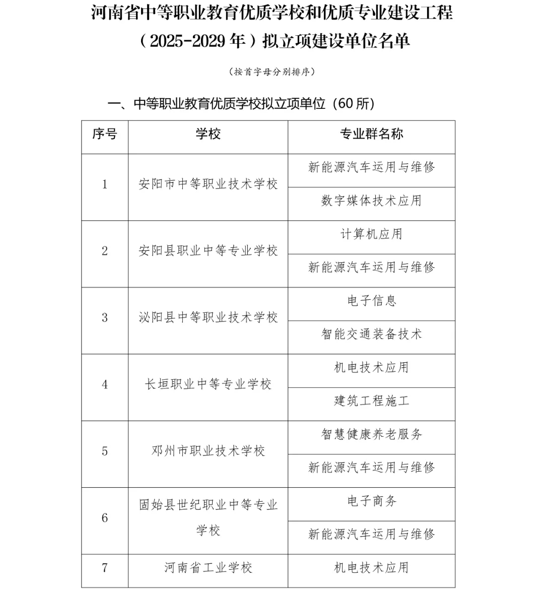 河南省教育厅 河南省人力资源和社会保障厅 河南省财政厅关于河南省中等职业教育优质学校和优质专业建设工程(2025-2029年)拟立项建设单位名单的公示根据《河南省教育厅 河南省人力资源和社会保障厅 河南省财政厅关于实施河南省中等职业教育优质学校和优质专业建设工程(2025-2029年)的通知》(教职成〔2025〕204号)要求,省教育厅、省人力资源社会保障厅、省财政厅组织开展了河南省中等职业教育优质学校和优质专业建设工程项目遴选工作,经学校申报、各地(有关部门)推荐、专家综合评审等环节,现将河南省中等职业教育优质学校和优质专业建设工程拟立项建设单位名单予以公示。