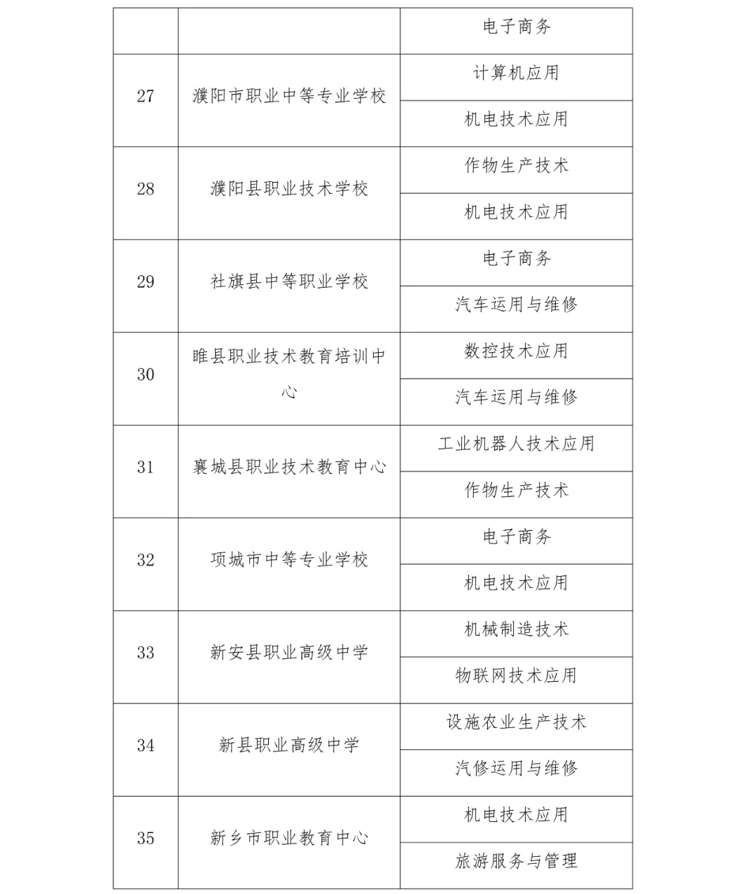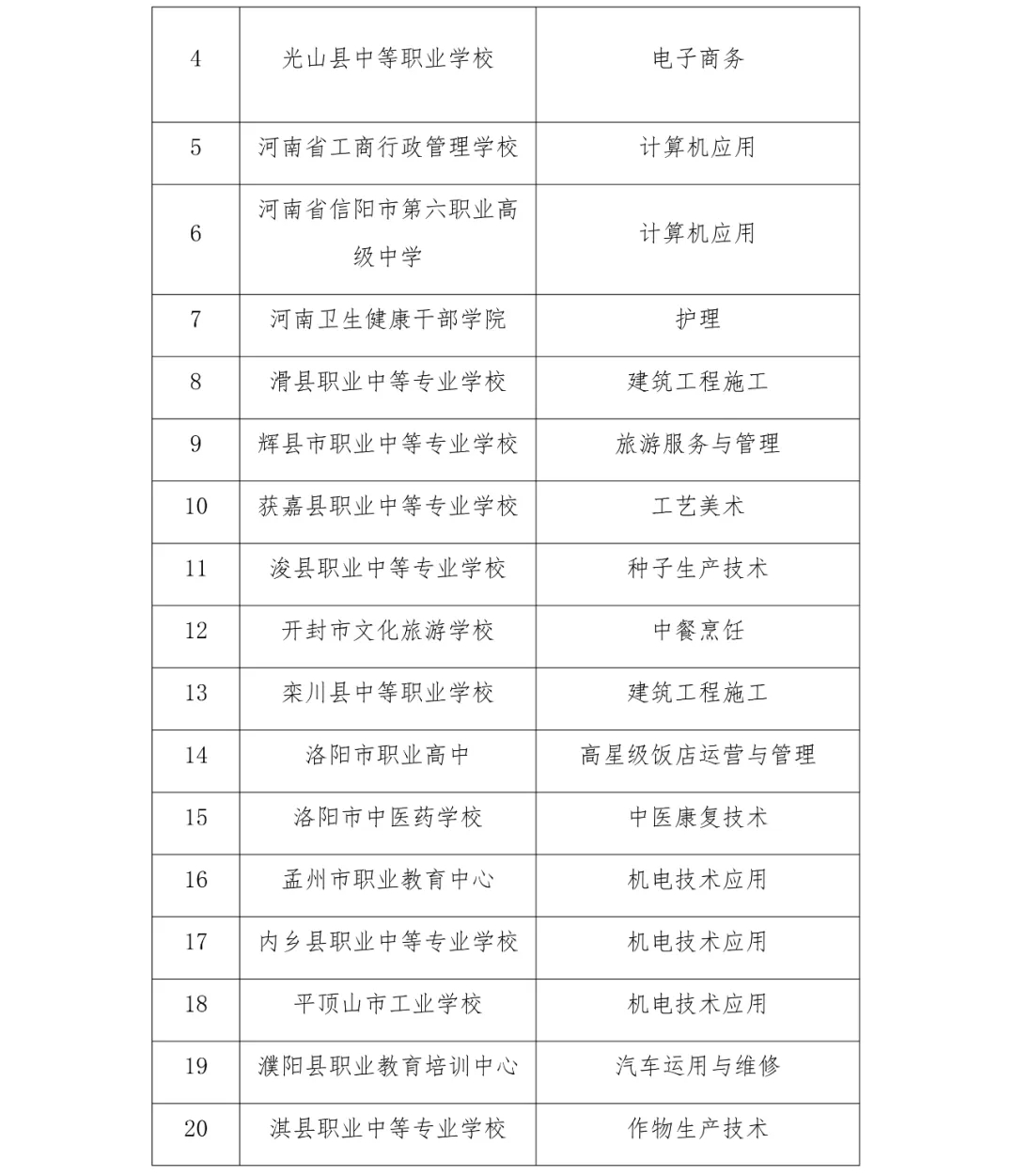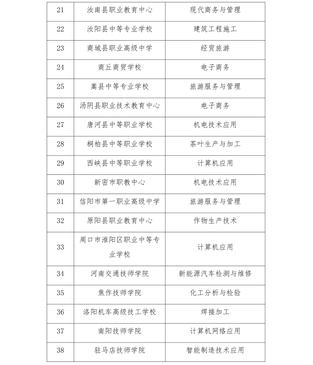 河南省教育厅 河南省人力资源和社会保障厅 河南省财政厅关于河南省中等职业教育优质学校和优质专业建设工程(2025-2029年)拟立项建设单位名单的公示根据《河南省教育厅 河南省人力资源和社会保障厅 河南省财政厅关于实施河南省中等职业教育优质学校和优质专业建设工程(2025-2029年)的通知》(教职成〔2025〕204号)要求,省教育厅、省人力资源社会保障厅、省财政厅组织开展了河南省中等职业教育优质学校和优质专业建设工程项目遴选工作,经学校申报、各地(有关部门)推荐、专家综合评审等环节,现将河南省中等职业教育优质学校和优质专业建设工程拟立项建设单位名单予以公示。