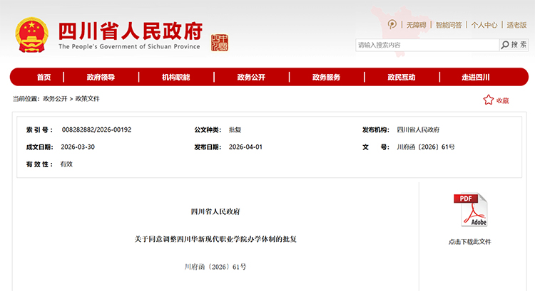 近日,四川省人民政府网站发布《关于同意调整四川华新现代职业学院办学体制的批复》,同意四川华新现代职业学院办学体制由“民办非营利”调整为“公办”。