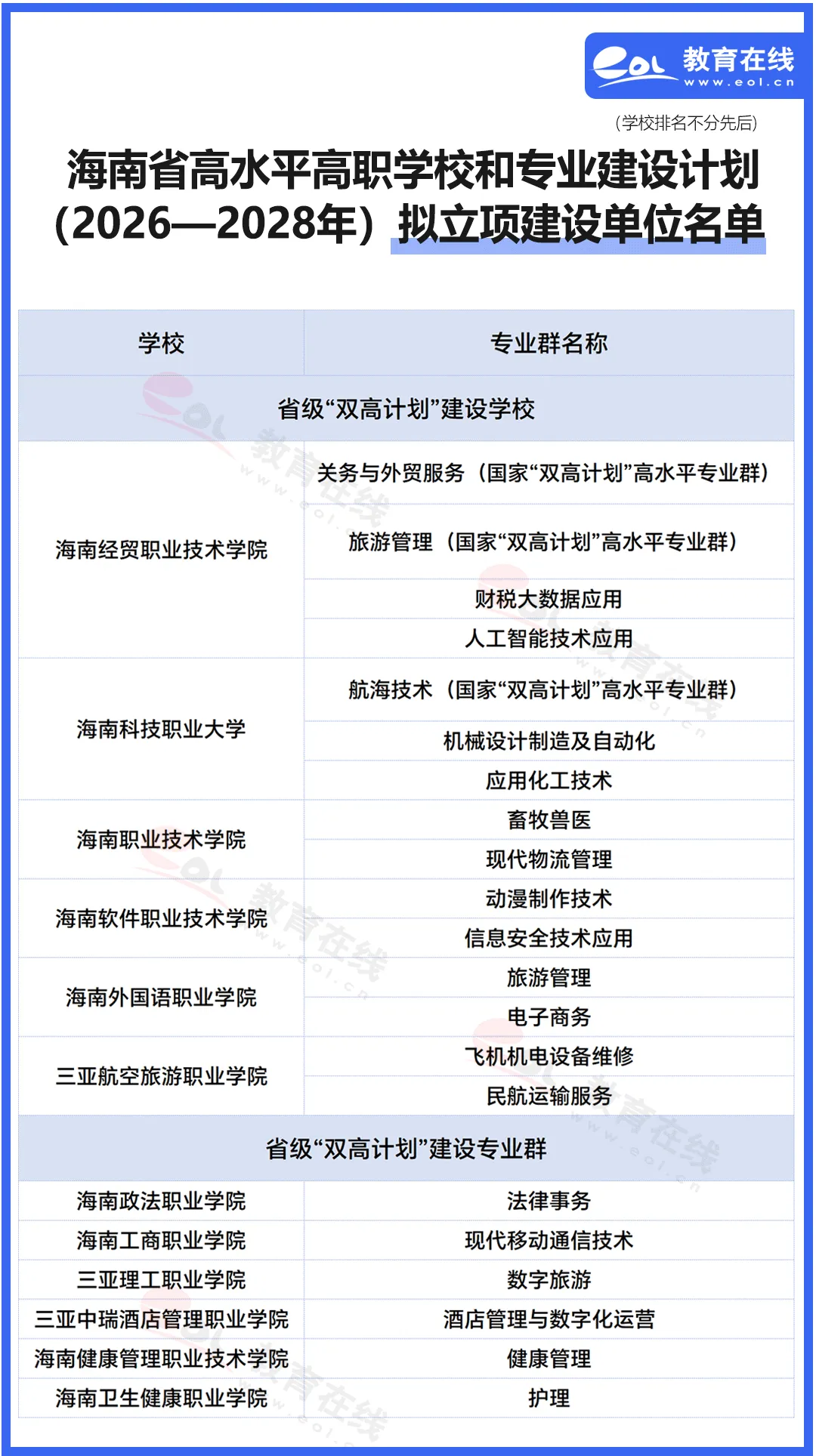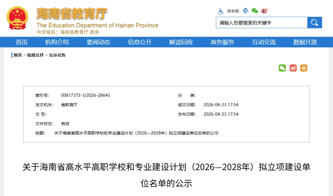 4月23日,海南省教育厅发布《关于海南省高水平高职学校和专业建设计划(2026—2028年)拟立项建设单位名单的公示》。
