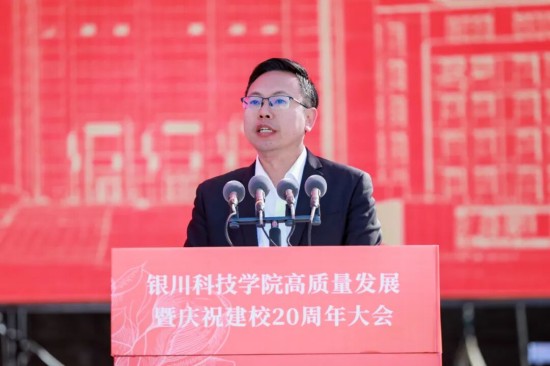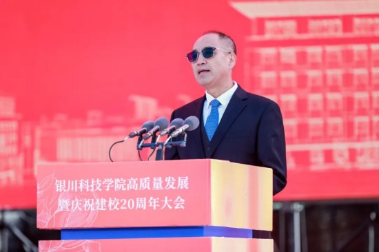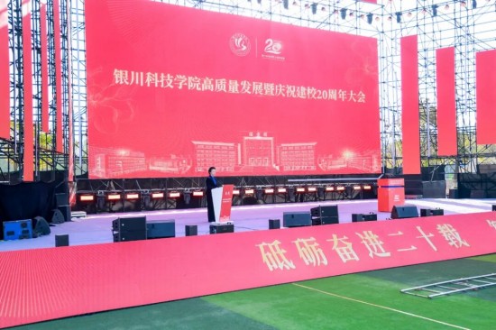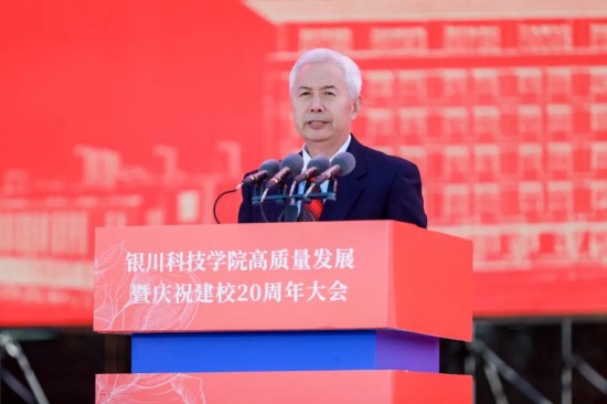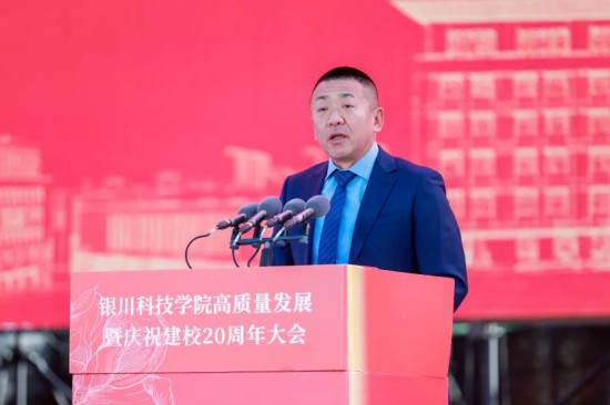 他讲到,银川科技学院建校20年以来诸多成绩的取得,是各级政府科学决策、大力支持的结果;是举办者厚植情怀、致力办学的结果;是历任领导笃定初心、攻坚克难的结果;是兄弟院校鼎力相助、同舟共济的结果;是历代教职员工无私奉献、潜心育人的结果;是历届校友心系母校、赓续薪火的结果。这份矢志不渝的教育热忱和负重拼搏的奋斗精神,为学校的长远发展奠定了坚实根基,注入了不竭动力,成就了今日的前行篇章。他强调,二十年的实践经验,未来的教育事业发展之路,必须始终坚持用习近平新时代中国特色社会主义思想铸魂育人,牢牢把握教育的政治属性、人民属性、战略属性,确保民办学校坚持正确政治方向、正确育人导向;必须始终坚持立德树人,以铸牢中华民族共同体意识为主线、黄河流域生态保护和高质量发展先行区建设为牵引,一体推进教育、科技、人才改革发展;必须始终坚持对接国家及区域重大战略,着力注重错位发展,持续增强内生动力,用心用情用力诠释教育使命,努力将教育这篇“论文”写在宁夏山川大地上,力争建成西北地区特色鲜明的高水平应用型民办本科高校,为加快建设美丽新宁夏提供有力支撑。