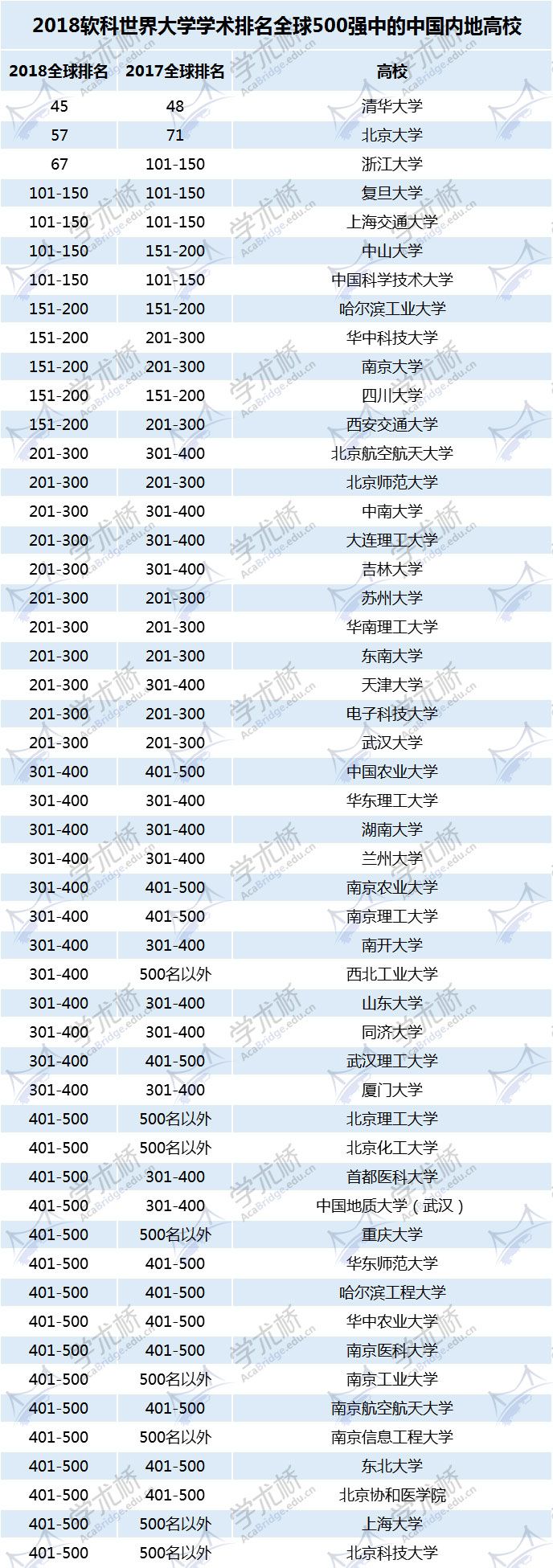 2018软科世界大学学术排名全球500强中的中国内地高校