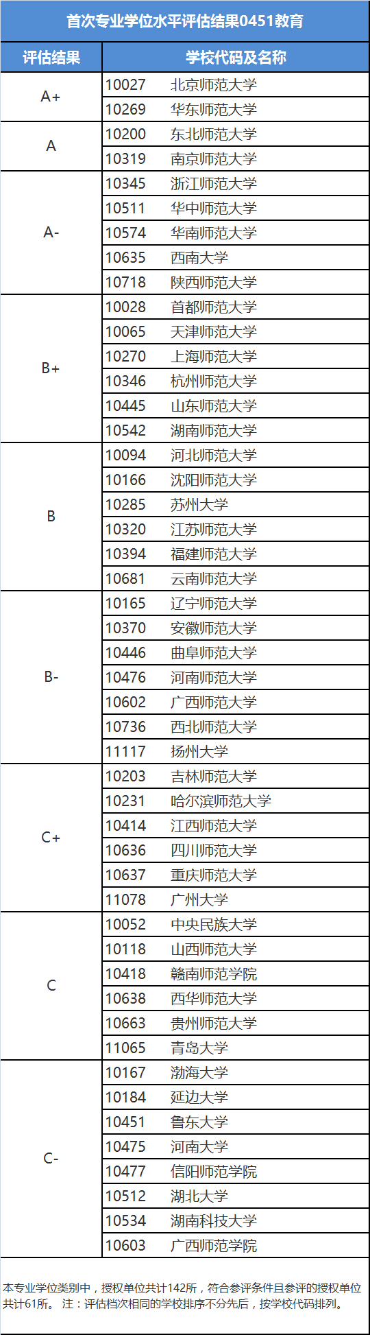 评估结果通过精准计算,按“分档”呈现,具体方法是按“专业学位整体水平得分”的位次百分位,将每个专业学位类别前75%的参评单位分为9档公布:前2%(或前2名)为A+,2%~7%为A(不含2%,下同),7%~15%为A-,15%~25%为B+,25%~35%为B,35%~45%为B-,45%~55%为C+,55%~65%为C,65%~75%为C-。