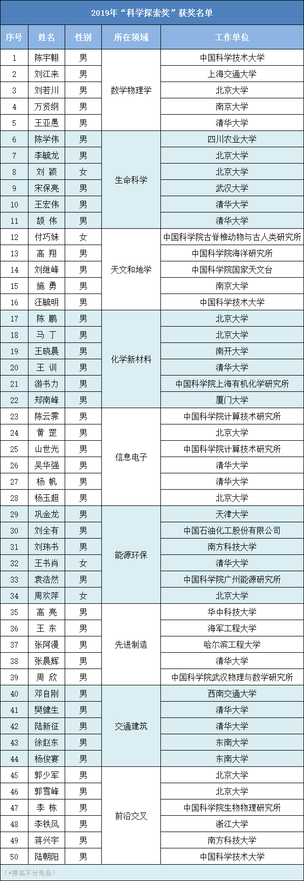 2019年度“科学探索奖”获奖人来自全国11个省市的26个科研单位、高校和企业。为了选拔和激励更多青年科技工作者,经过评审委员会决定,在奖项评审中采用“新星机制”——在同等申报条件下,年纪更轻者胜出。最终50位获奖人中,35岁及以下获奖人有9位,比例接近20%,充分体现了该奖项激励青年科技工作者的初衷。